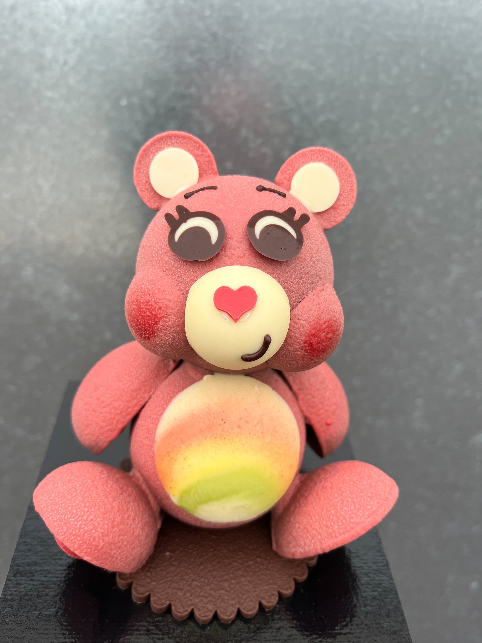 Socle en Chocolat noir équatorial, bisounours en chocolat lait & blanc.