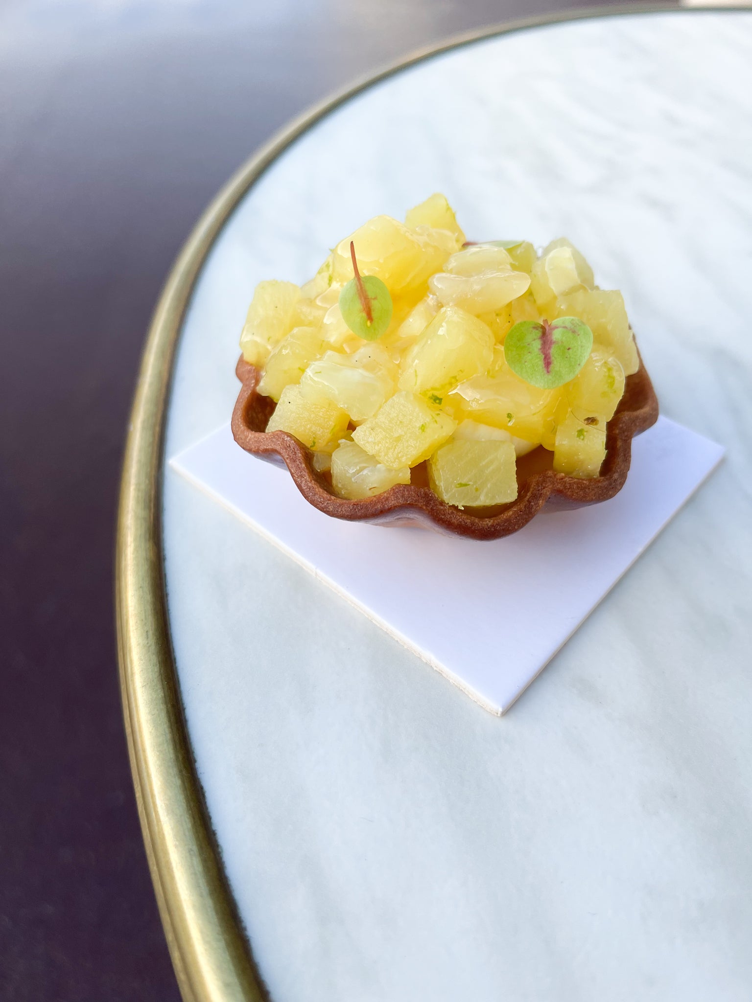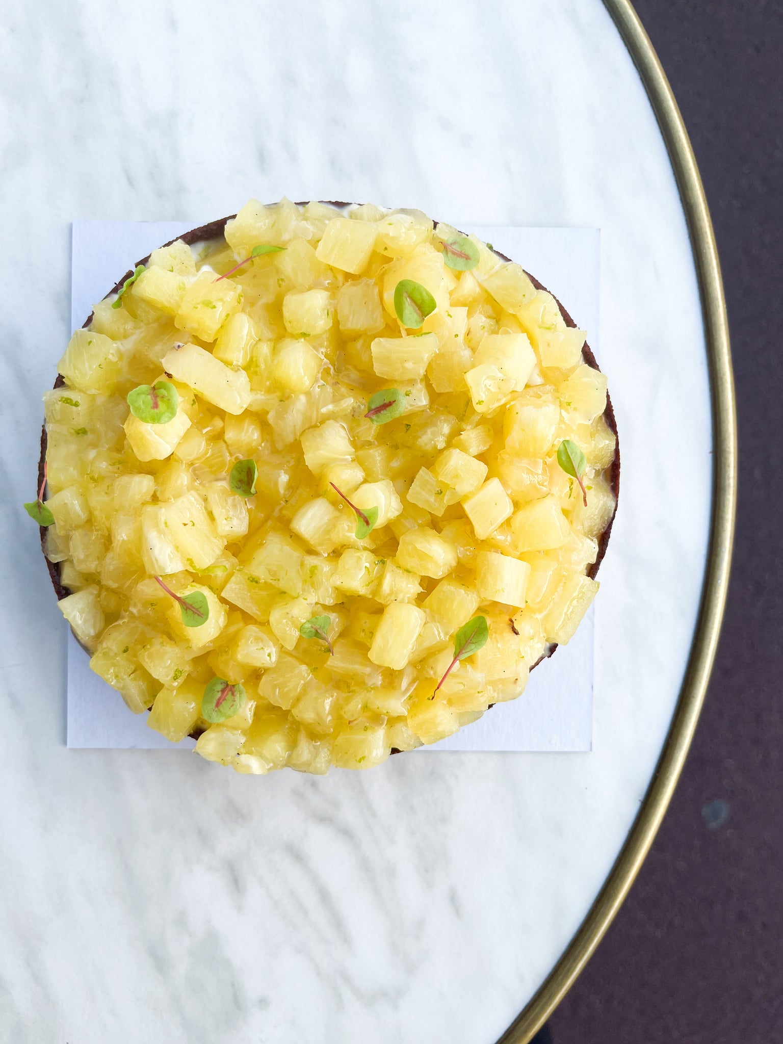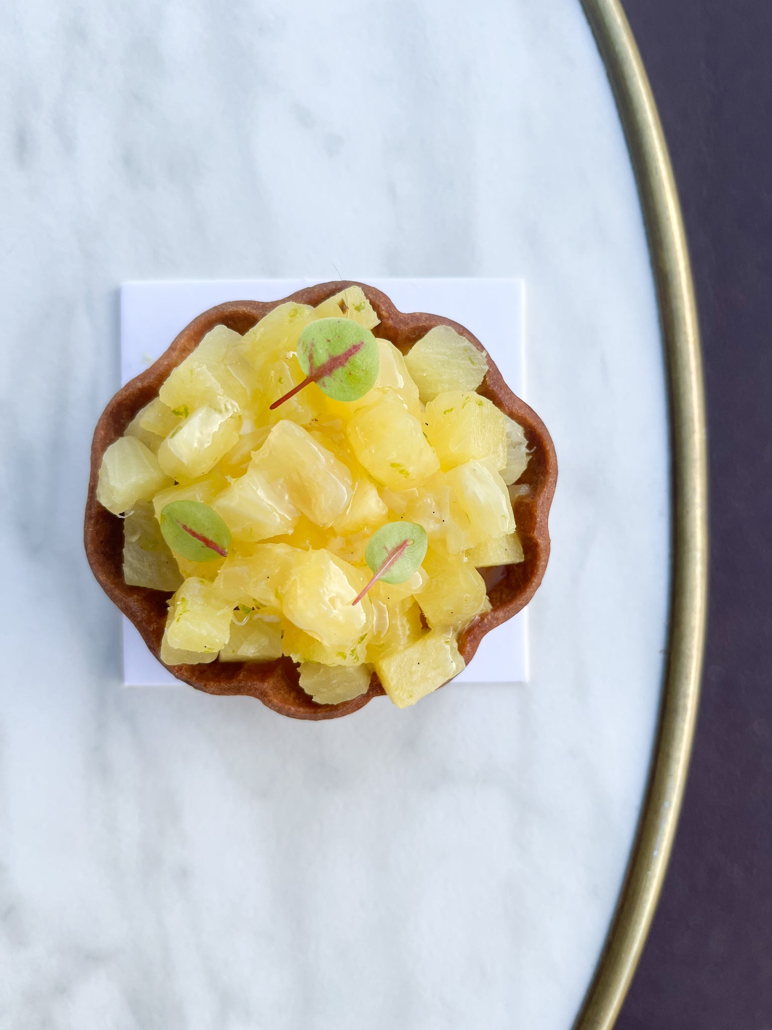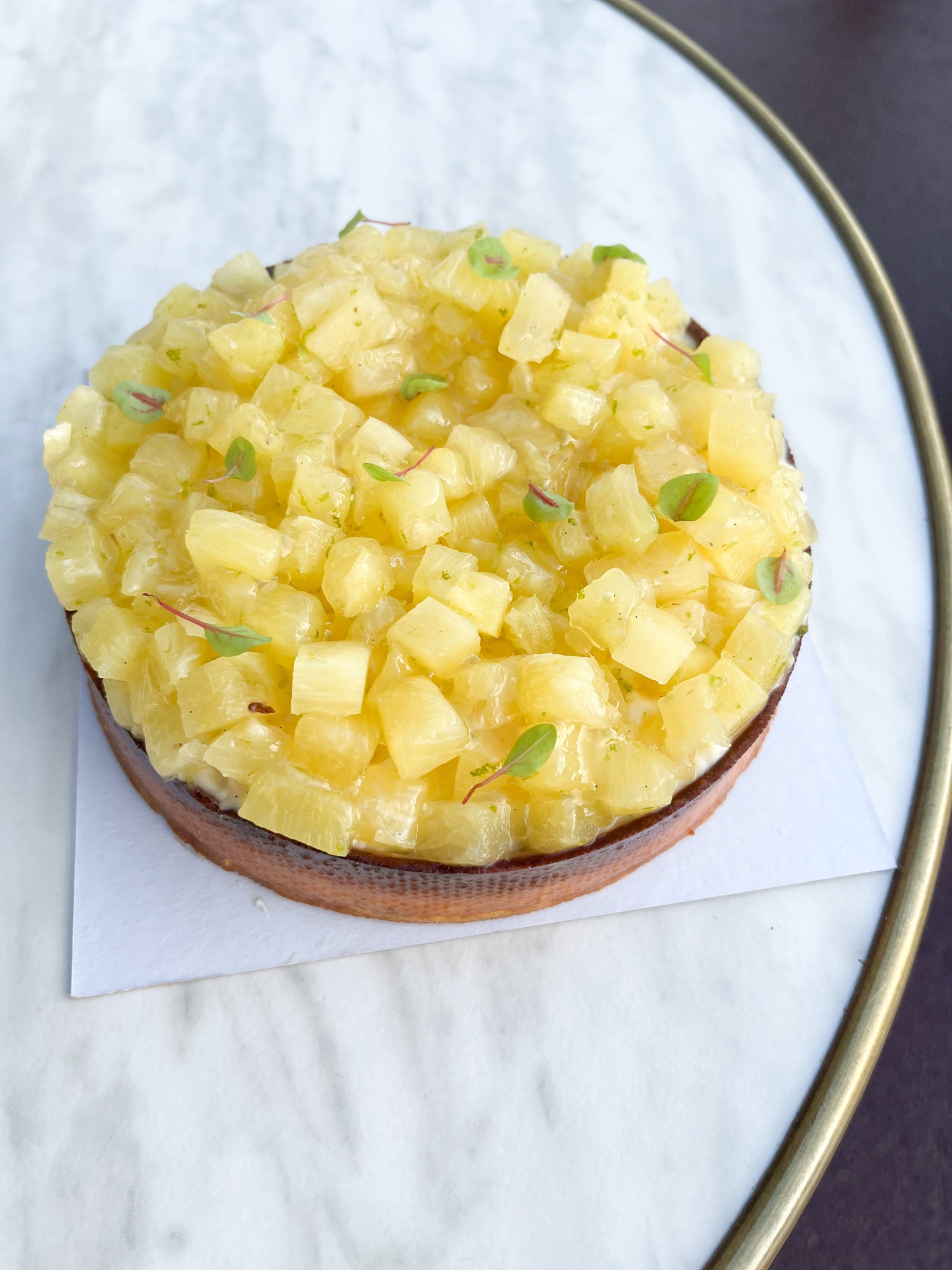 Pâte sucrée, crème d’amandes à l’ananas, crème mousseline à la vanille de Madagascar, ananas poché, confit exotique, zestes de citron vert et coriandre.